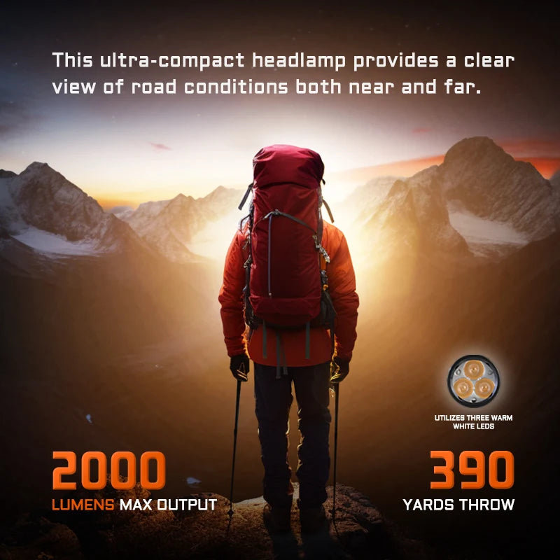 Illuminate your path with the ACEBEAM H17 2.0 headlamp, featuring three 4000K neutral white LEDs with CRI 90, delivering an impressive 2000 lumens and a beam distance of 128 meters. Ideal for outdoor enthusiasts and professionals alike!